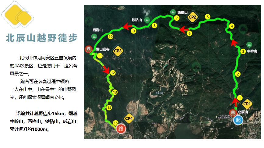 线路以北辰山越野专用道路为主,须在安全向导教练的指引下沿指定路线安全行进,不得随意脱离队伍。